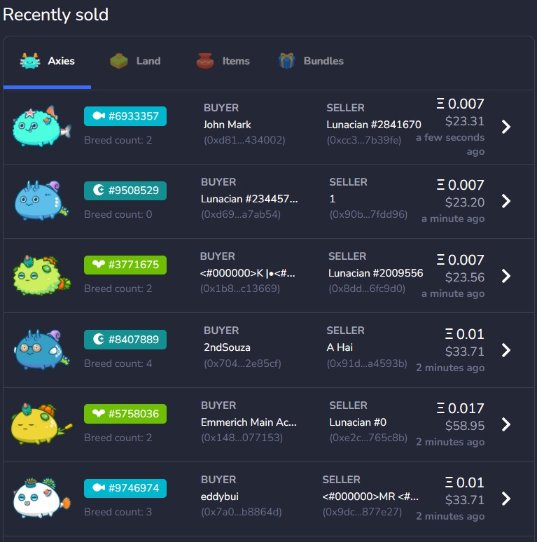 一是靠游戲中的寵物繁衍賺錢。玩家可選擇消耗產出的SLP幣來使兩只寵物繁衍后代,后代屬性由父母基因隨機決定。多次配種將有望繁衍出極品的寵物,但玩家的SLP幣消耗也會指數級增長。強力寵物既可直接出售換取現金,也可作為“生產工具”加入隊伍中以提升勝率,增加SLP幣產出。