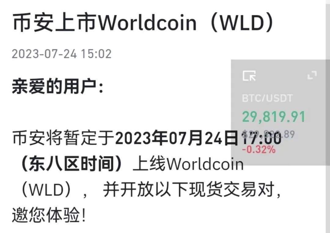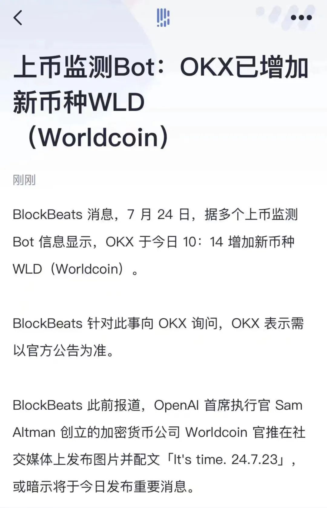 突發. 世界幣Worldcoin上線五大交易所 秒漲20% Bi安 下午五點上線