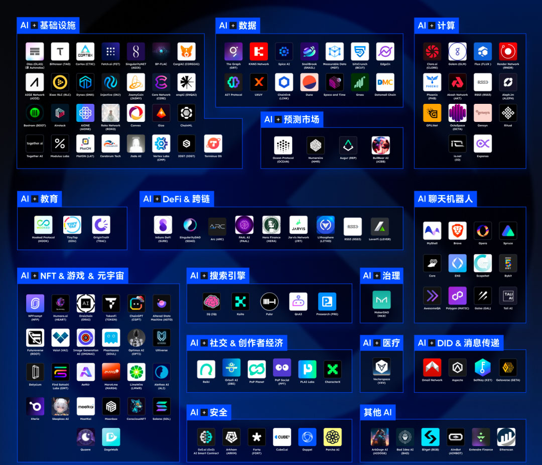 Foresight News 曾于去年 12 月整理 2022 年 20 個與 AI 技術相關的融資項目。一年后,Foresight News 進一步對 Web3 + AI 賽道進行全景盤點。據筆者不完全統計,目前行業至少有 139 個 Web3 + AI 概念項目,已發幣的項目共有 84 個,還有部分將于明年發行Tokens。這 139 個項目覆蓋了基礎設施、數據、預測市場、計算與算力、教育、DeFi & 跨鏈、安全、NFT & 游戲 & 元宇宙、搜索引擎、社交 & 創作者經濟、AI 聊天機器人、DID & 消息傳遞、治理、醫療、交易機器人等諸多方向。其中,基礎設施類項目多達 29 個,NFT & 游戲 & 元宇宙類項目有 26 個,數據、計算、AI 聊天機器人類項目也均在 10 個以上。