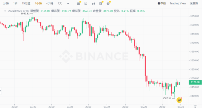 在Ethereum現貨ETF上市的第二天,整體市場凈流出1.33億美元,其中灰度的ETHE貢獻了大量的資金流出。據Farside Investors的數據,ETHE在第三天(7月25日)再度流出3.462億美元。這直接導致以太幣價格大幅下跌,ETH價格一度跌破3,100美元,截至截稿前報3,178美元,24小時跌幅高達4.61%。