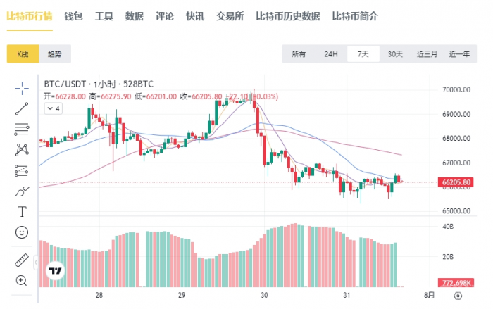 7月31日,據(jù)Blockchain網(wǎng)行情數(shù)據(jù),Bitcoin多頭試圖守住66,500美元的支撐位,但在凌晨失敗,導(dǎo)致午盤后跌至65,526美元的低點,空頭尋求測試65,000美元支撐位的強度。截至發(fā)稿時,Bitcoin價格回升至66,205美元,24小時跌幅0.95%。