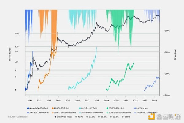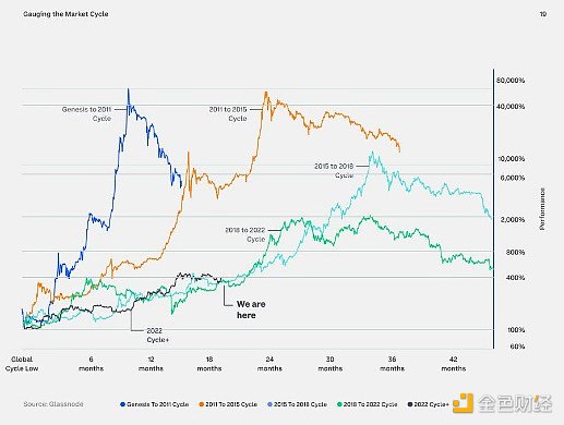 BTC已經(jīng)經(jīng)歷了4輪市場周期,各周期都有自己的牛市和熊市階段。本輪周期始于2022年,BTC價格較2022年11月的低點上漲了400%。本周期與2018-2022年周期類似,當(dāng)時BTC價格較低點上漲了2000%。