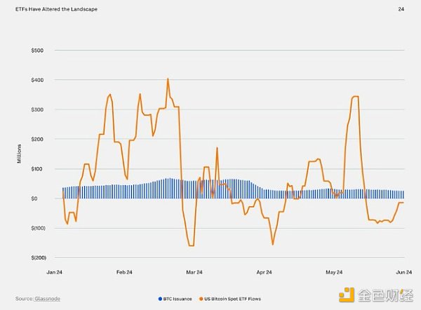 現(xiàn)貨ETF推動了對BTC的大量新需求,而新的BTC供應(yīng)仍然局限于礦工獎勵。自現(xiàn)貨ETF開始交易以來,ETF的需求大大超過了BTC的發(fā)行量。