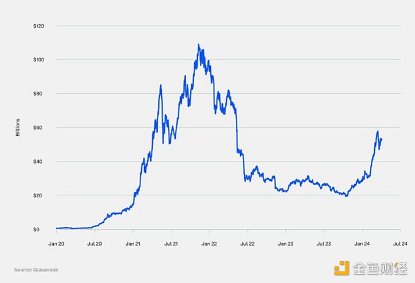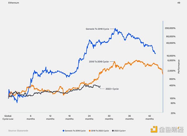 ETH已歷經(jīng)兩個完整的市場周期。本輪周期始于2022年,自2022年11月以來,ETH上漲了240%以上。本輪周期與2018-2022周期相似,ETH價格較低點上漲了6000%。