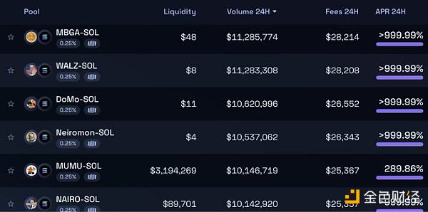 在過去 24 小時(shí)內(nèi),Raydium 標(biāo)準(zhǔn) LP 上有超過 50 個(gè)交易量超過 250 萬美元的跑路項(xiàng)目,總共產(chǎn)生了超過 2 億美元的交易量和超過 50 萬美元的費(fèi)用。Orca 和 Meteora 的跑路似乎要少得多,而我在 Uniswap (ETH) 上很難找到任何具有任何有意義交易量的跑路項(xiàng)目。