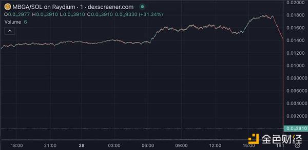 每一個(gè)低流動(dòng)性池都是在過去 24 小時(shí)內(nèi)跑路的項(xiàng)目。以 MBGA 為例,在過去 24 小時(shí)內(nèi),Raydium 上發(fā)生了 46,000 筆交易,交易量達(dá) 1,080 萬美元,2,845 個(gè)獨(dú)立錢包進(jìn)行買賣,并產(chǎn)生了超過 28,000 美元的費(fèi)用。(請(qǐng)注意,類似規(guī)模得到廣泛認(rèn)可的LP,MEW,僅生成了 11.2K 筆交易)