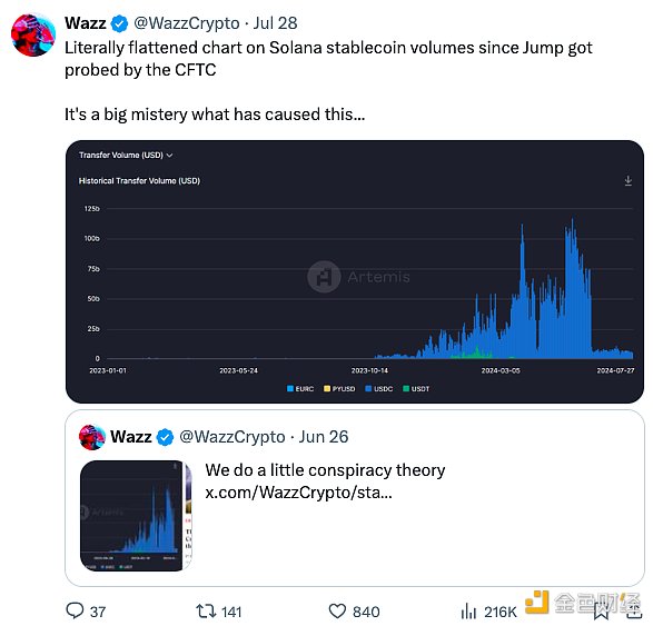 穩(wěn)定幣交易量動(dòng)態(tài)凸顯了這一點(diǎn),@WazzCrypto注意到 CFTC 宣布調(diào)查 Jump 后穩(wěn)定幣交易量突然下降: