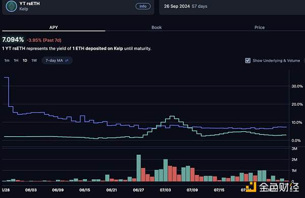 Pendle YT 市場(chǎng)對(duì) LRT WrapETH 資產(chǎn)的定價(jià)區(qū)間已經(jīng)降至 6%~7%。目前,Renzo 的 rsETH 的 YT 最高,但也僅有 7.1%。這個(gè)幣本位收益率水平,已經(jīng)很難吸引 ETH 持有者和空投農(nóng)民冒著本金損失的風(fēng)險(xiǎn)質(zhì)押和再質(zhì)押 ETH。