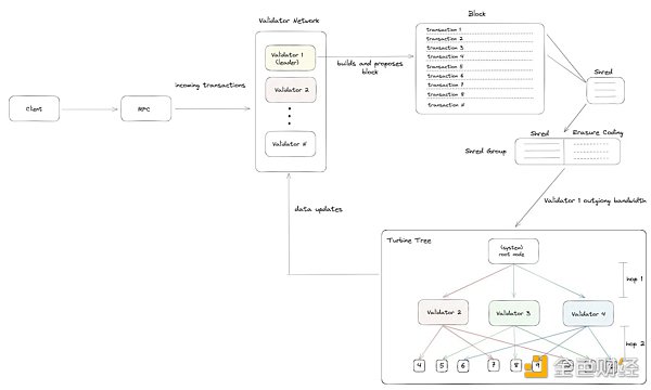 Turbine 將數據分片以后,使用多層傳播機制來進行傳播,Leader Node會在每個 Slot 結束之前將區塊交給任意一個區塊驗證者,然后該驗證者會將區塊分片成 Shreds,并且生成糾刪碼,該驗證者之后會開啟 Turbine 傳播。首先要傳播到根Node,然后該根Node會確定哪些驗證者位于第幾層。其過程如下所示: