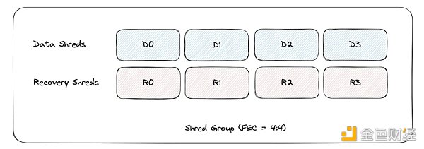 Leader Node通過稱為 Sharding 的過程將區塊拆分為 shred 的子區塊,其規格大小以 MTU(最大傳輸單元,無需將其分割成更小的單元即可從一個Node發送到下一個Node的最大數據量)為單位。然后通過使用 Reed-solomon 擦除碼方案來保障數據的完整性以及可用性。