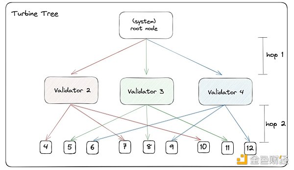 在 Solana 中,由于存在大量的驗證者投票交易,并且由于 Leader Node中心化帶來的高效以及 400 ms 的 Slot 時間,這就導致了整體區塊大小以及出塊頻率都特別高,大區塊在傳播時,也會給網絡造成很大的壓力,Solana 采用 Turbine 機制來解決大區塊的傳播問題。Turbine