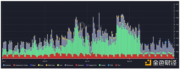 值得注意的是,DEX 的交易其中大約 50% 都是由 MEV bot 發起的,主要是其低廉的費用和 Meme 交易活躍滋生了 MEV 的有利可圖。而這也是導致用戶高峰交易失敗頻發、宕機的主要原因之一。