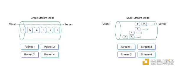 TCP 可靠性高于 UDP,但是 UDP 的速率高于 TCP,因為 TCP 會在包丟失的時候具備擁塞控制機制,重新傳輸丟失的包。UDP 速率高,可靠性低,Goggle 希望構建一個可靠性高且速率高的傳輸層協議 QUIC。QUIC 最核心的特性就是相互獨立的邏輯流。它允許在單個連接上并行傳輸多個數據流,并且每個流可以獨立地處理。相比之下,TCP 只支持單數據流,需要按照發送順序接收和確認每個報文。