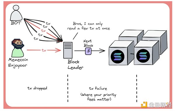 Solana 宕機的主要原因就是使用了該 QUIC 實驗性應用層協議,由于 UDP 以及多路傳輸的快捷,并且希望保持完整數據的傳輸,因此其也會設計機制來對丟包情況進行多次重傳。Leader Node在接收多個交易時,是通過 QUIC 協議開啟多個通路進行的,但是 Leader Node畢竟是一臺計算機,尤其能夠處理的交易容量上線,因此在發生大量的交易涌入時,Leader Node就會切段某些通路連接,這就會導致交易被 drop。如何選擇將被切斷的連接并沒有一套既定的標準(比如切斷所有費用低于 xxx 的連接),所有連接是否會被切斷都是隨機性的。因此這就導致了存在一定黑箱操作的空間,Leader Node可能更傾向于有利可圖的 MEV 交易,而放棄用戶的低價值交易。MEV